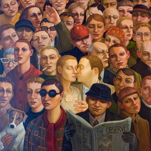 Yet a nod to voyeurism is found here, as one man is reading The Observer, a woman reads over his shoulder, and an elderly man whispers into the ear of a woman.