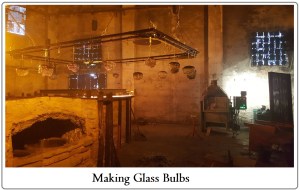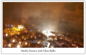 The interior of the factory is dark and smoky, punctuated by bright lights from high windows and the fire in the furnaces. The play of the lights, glass bubbles, smoke and furnace is mesmerizing. Each bubble encloses a light, and the bubbles intermittently light up in sections or across the entire sculpture. In a happy circumstance, a dinner hosted in the factory the previous night left large silver tables set up the length of the room. The line of tables mirrored the glass bubbles, fires and sunlight from the windows for even more dramatic photographs.