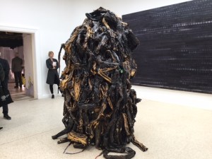There we find in the center of the room a tall sculpture of twisted ropes of black paper partially bleached yellow. The viewer does not need to be told that the artist named it “Medusa.” It’s powerful, seething mass, is both complemented and counterbalanced by the works that surround it on the walls. In these pieces Bradford has returned to a form he explored earlier in his artistic career. Endpapers—used in styling women’s hair, and here dyed shimmering shades of purplish-black, create compositions of subtle color gradations that invite the eye to explore their nuances. The use of endpapers is inspired by Bradford’s early life. His mother is a hairdresser and owned a beauty salon in which he worked for years. When asked why he had returned to this medium, he replied simply that he “hadn’t finished with it, there were still some paintings I wanted to do”. He added that he had stopped doing them because he felt they had led people to reduce his life down to a rap video—a “black hairdresser from south central Los Angeles.” But, “black people’s stories are as diverse and messy as everybody else’s. I just want diversity.”