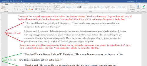 Maybe you don’t care about those rules, but editors and publishers do, and they are the people you want to please. They don’t have time to deal with a manuscript that is justified, single spaced, has block paragraphs, has an extra space between each paragraph, and is in Papyrus font .10.