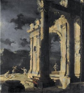 Wikimedia Commons contributors, “File:An architectural capriccio with figures amongst ruins under a stormy night sky, oil on canvas painting by Leonardo Coccorante.jpg,” Wikimedia Commons, the free media repository, https://commons.wikimedia.org/w/index.php?title=File:An_architectural_capriccio_with_figures_amongst_ruins_under_a_stormy_night_sky,_oil_on_canvas_painting_by_Leonardo_Coccorante.jpg&oldid=291488853 (accessed May 19, 2019).