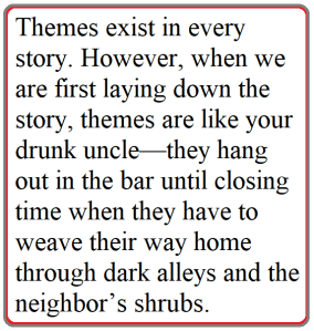 Sometimes, even if we have plotted in advance, we can’t identify the central theme of the story. Theme is what the story is about on a deeper level than what is seen on the surface. It’s the big meaning, a thread that is woven through the entire story, and sometimes it is an unstated moral for the reader to infer.