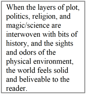 The layers of plot, politics, religion, and magic/science must be interwoven with bits of history, and the images and odors of the physical environment. Together, these layers help create the setting of any world.