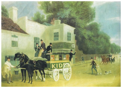 This painting of Kidd’s Omnibus was created for a circa 1840 calendar by James Pollard, who was considered an adequate draftsman and illustrator in his day. It was most likely printed in his father, painter and publisher, Robert Pollard’s, printshop, as he was his father’s primary illustrator. [4]