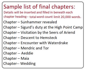 At first, the page is only a list of  headings that detail the events I must write for each chapter. I know what end I have to arrive at, but the chapter headings are pulled out of the ether, accompanied by the howling of demons as I force my plot to take shape: