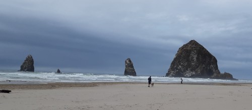 The beach stretches four miles from Ecola Creek to Arch Cape. It’s a sandy shoreline, dotted with sea stacks. Several smaller sea stacks surround the grand master, the Monarch of the Beach who sits near the center, the megalith known as Haystack Rock.