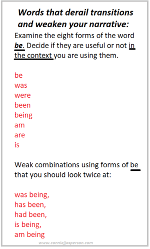 If it takes more than a paragraph to make the transition, I must be vigilant in my revision. If I must give information, I look for and change all the passive “code words” to active prose. I’ve posted this list before, but if you didn’t copy it then, here is your opportunity.