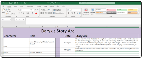 I do this for every project or series, and you can do the same. If you don’t have Excel, you can use any free spread-sheeting program, such as Google Sheets. It’s just a visual way to keep things organized and avoid introducing conflicting elements.