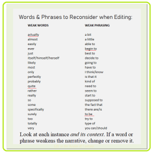 Limiting descriptors and quantifiers to conversations makes a stronger narrative. We use these phrases and words in real life, so our characters’ conversations will sound natural. The fact we use them in our conversation is why they fall into our first drafts.