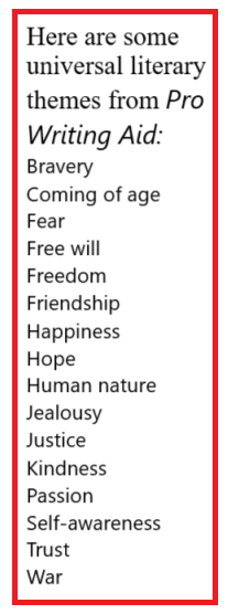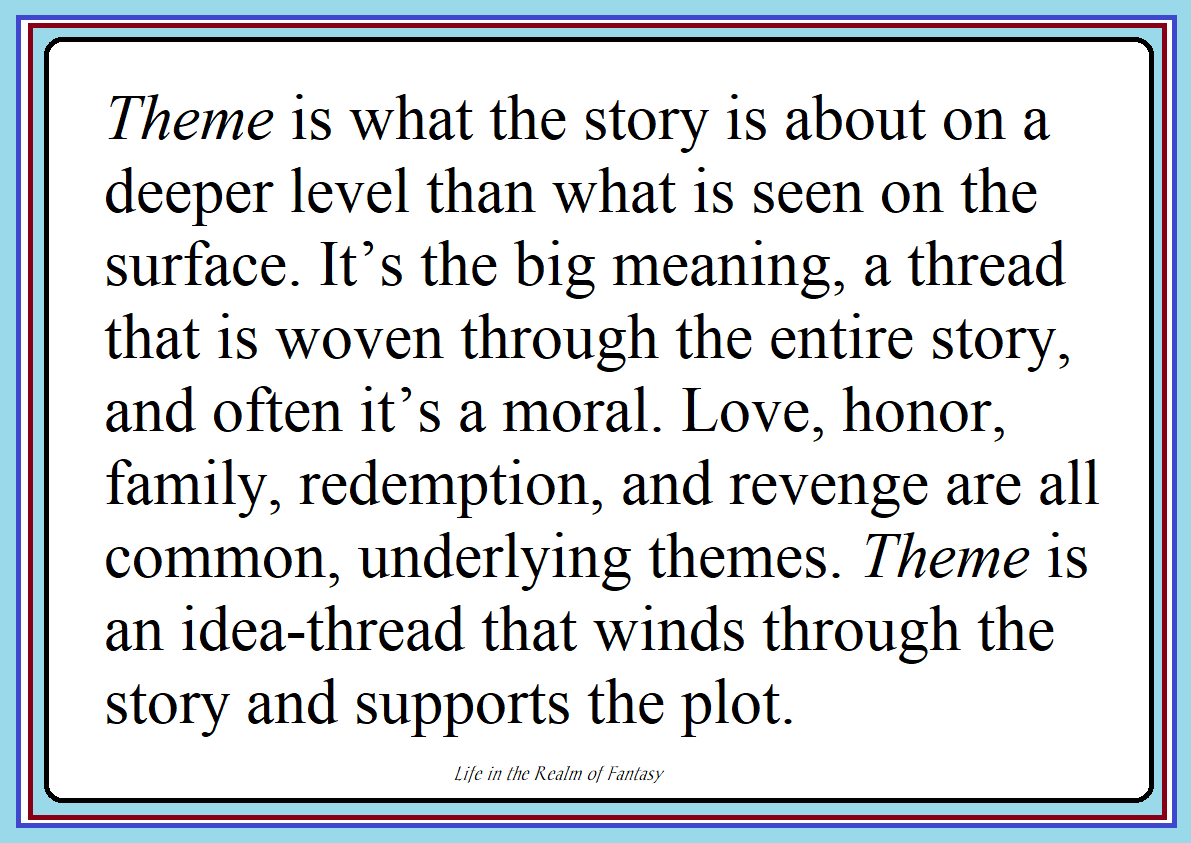 But first, what is a theme? It is an idea, an unspoken message that winds through the arc of the story and generates action. Themes are subtle but move the characters to action and define why the action happens. For an incredible list of themes, go to A Huge List of Common Themes – Literary Devices.