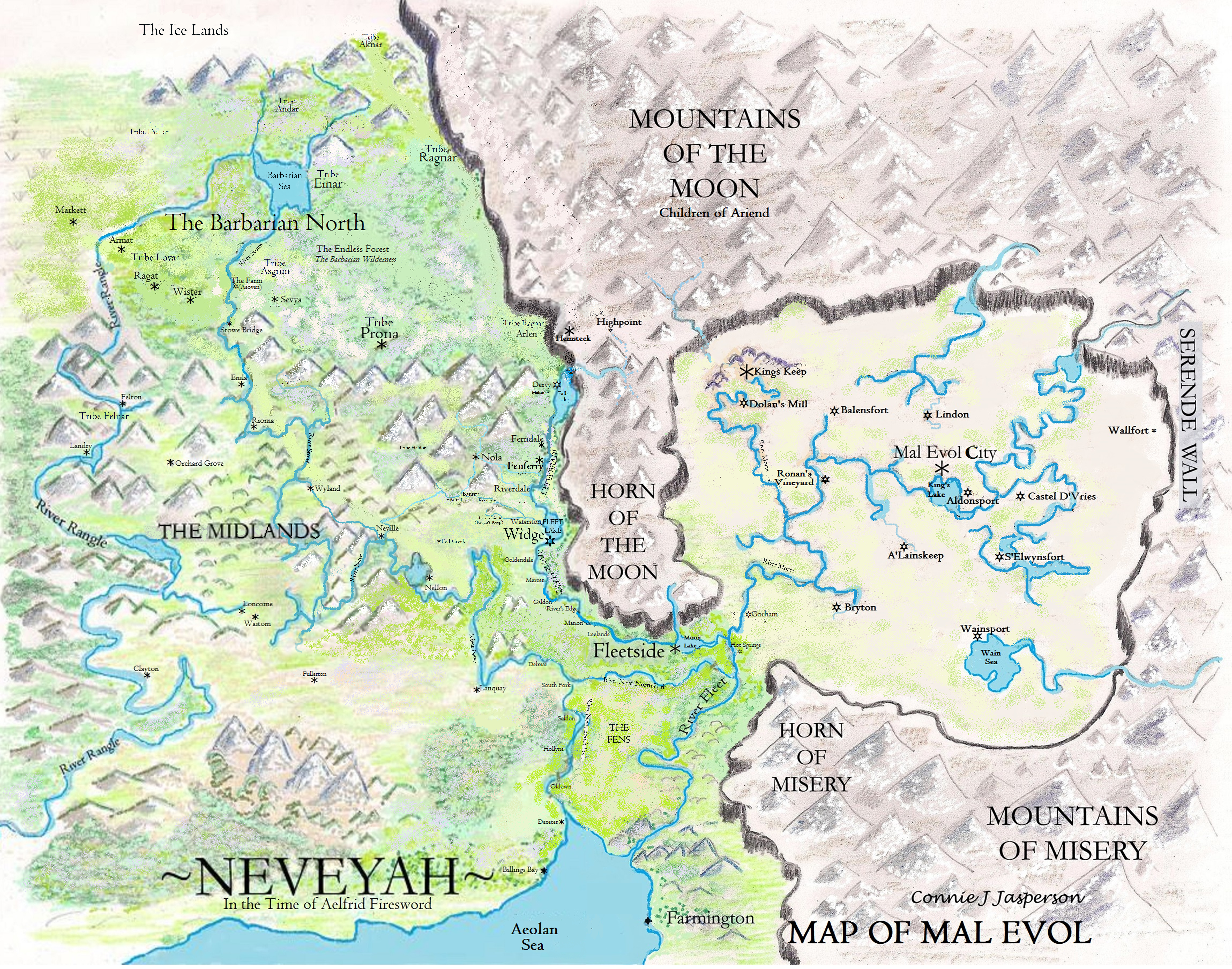 You don’t have to be an artist to draw a rudimentary map of an imaginary place. The rudimentary elements of the first map of my World of Neveyah series were scribbled on graph paper during a phone conversation. It evolved from there to the map you see at the left.