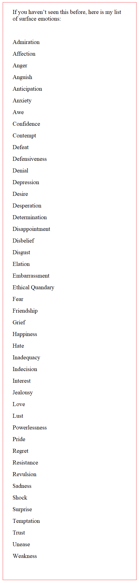 Surface Emotions List