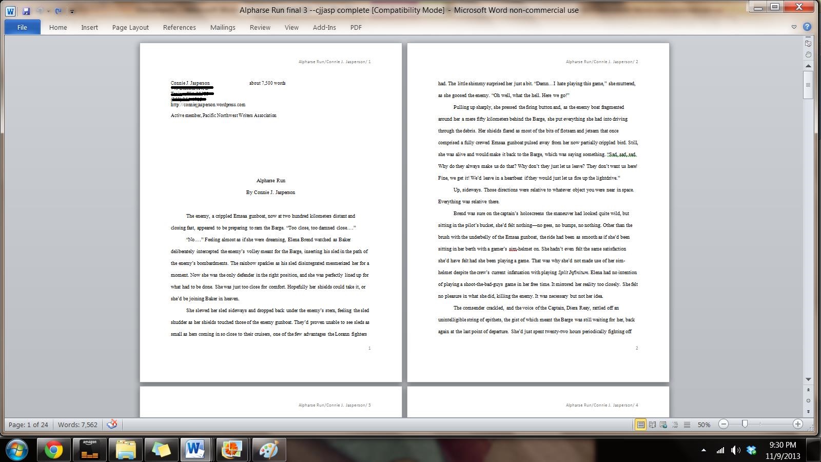 The header contains the title and your pen name. The first page contains your legal name, mailing address, contact information in the upper left-hand corner, and the word count on the right.