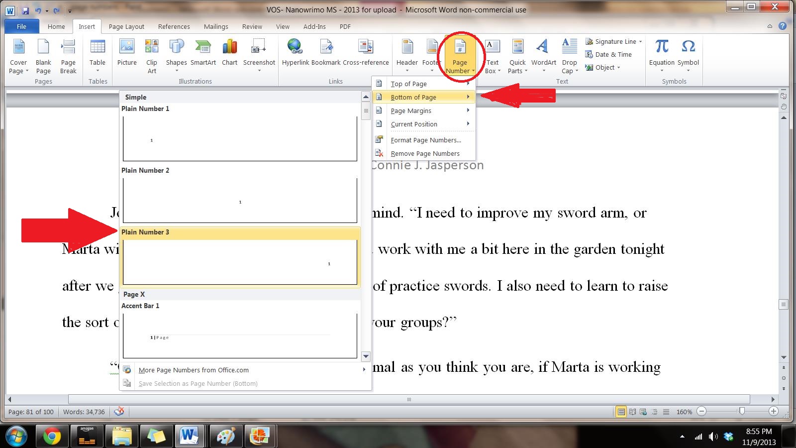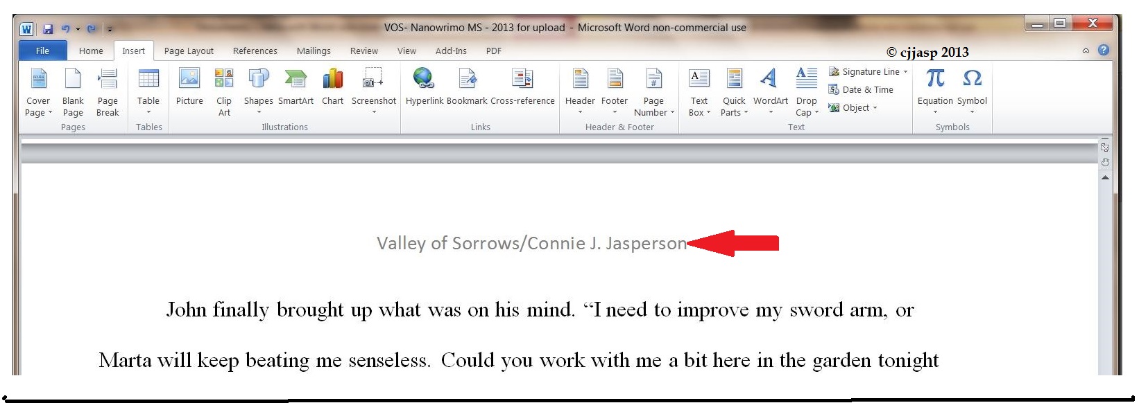 You will insert the Title of the Book and Your Author Name just before the page number. That way, it will look tidy and be aligned to the right. You can do this on the page number tab.