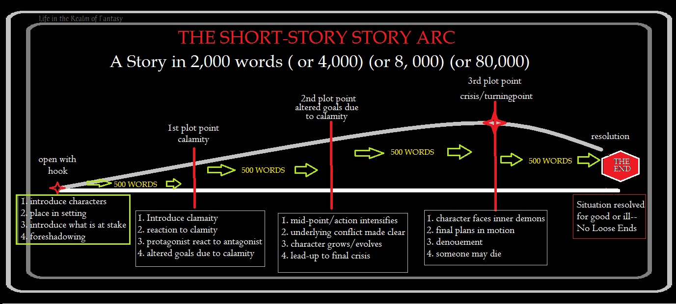 The Setup: The first 250 words are the setup and hook. You must have a compelling hook. In some cases, the first line is the clincher, but especially in a short story, by the end of the first page, you must have your reader hooked and ready to be enthralled.