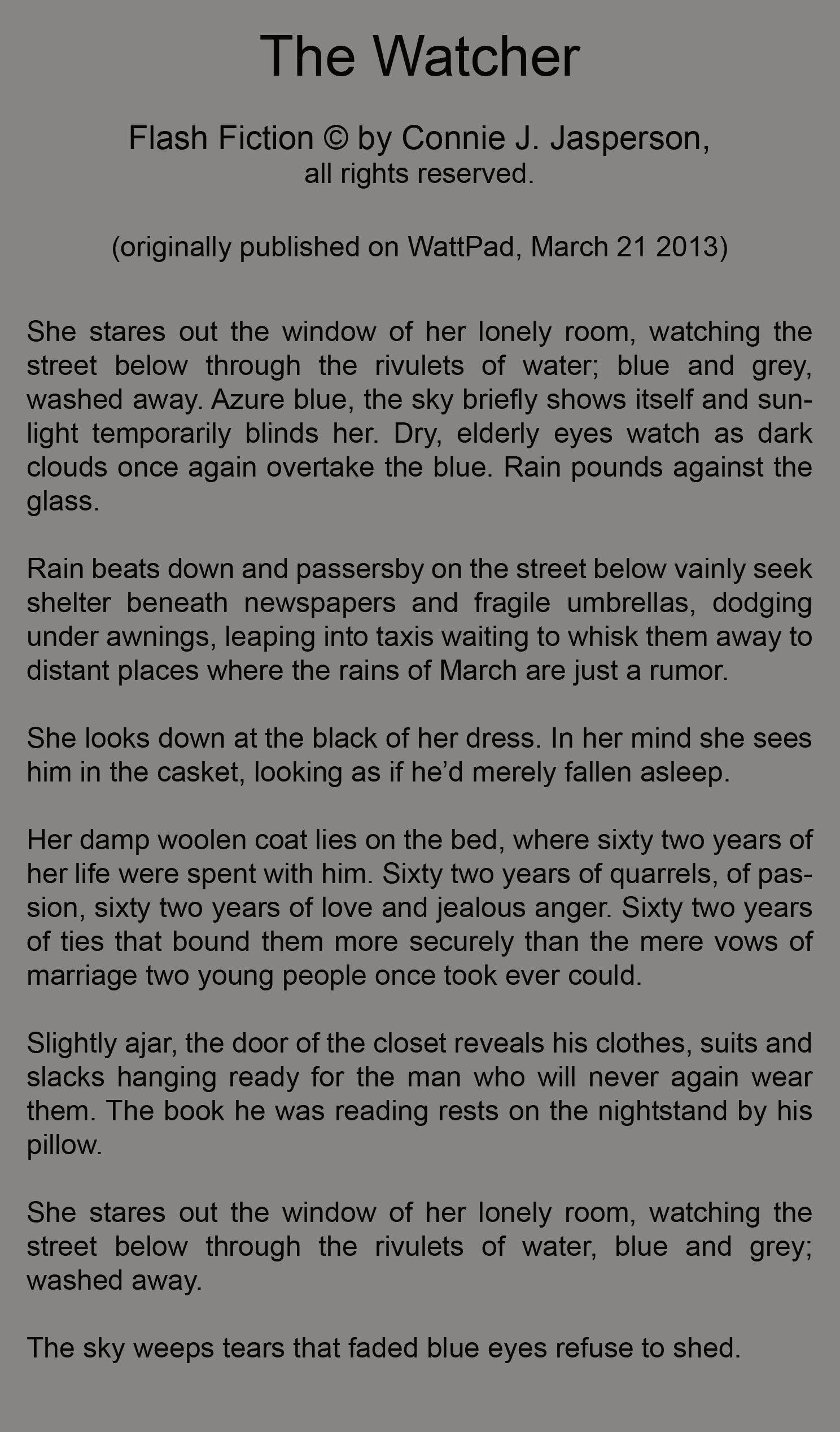 It is set in a contemporary environment with no fantasy elements. The idea came from the painting at the top of this post by Paul Cornoyer, and the action is minimal–an elderly woman staring out a window. But the theme is grief, and everything in these short paragraphs points to and represents her sense of loss.