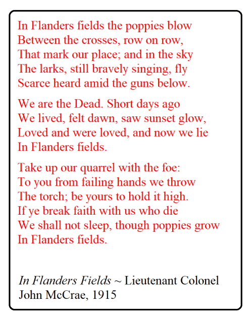 Wikipedia contributors, “In Flanders Fields,” Wikipedia, The Free Encyclopedia, https://en.wikipedia.org/w/index.php?title=In_Flanders_Fields&oldid=781662754 (accessed May 28, 2017).