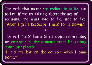 The verb that means “to recline” is “to lie,” not “to lay.” If we are talking about the act of reclining, we use “lie,” not “lay.” “When I have a headache, I lie down.”