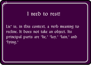 But I needed to rest. In this context, lie is a verb meaning to recline. It requires no direct object, and its principal parts are lie, lay, lain, and lying.