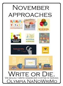 Such is NaNoWriMo—you never know what will happen during that month of madness and hilarity. I’ve been participating since 2010 and a Municipal Liaison since 2012, and every year is different. Some years I can only churn out short stories and poetry; other years, I’m cursed with novels.