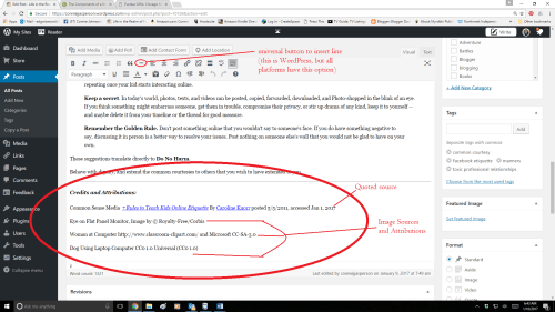 All this information for your images and any quotes from other sources should be listed at the BOTTOM of your current document as you find it, so everything you need for your blog post is all in one place.